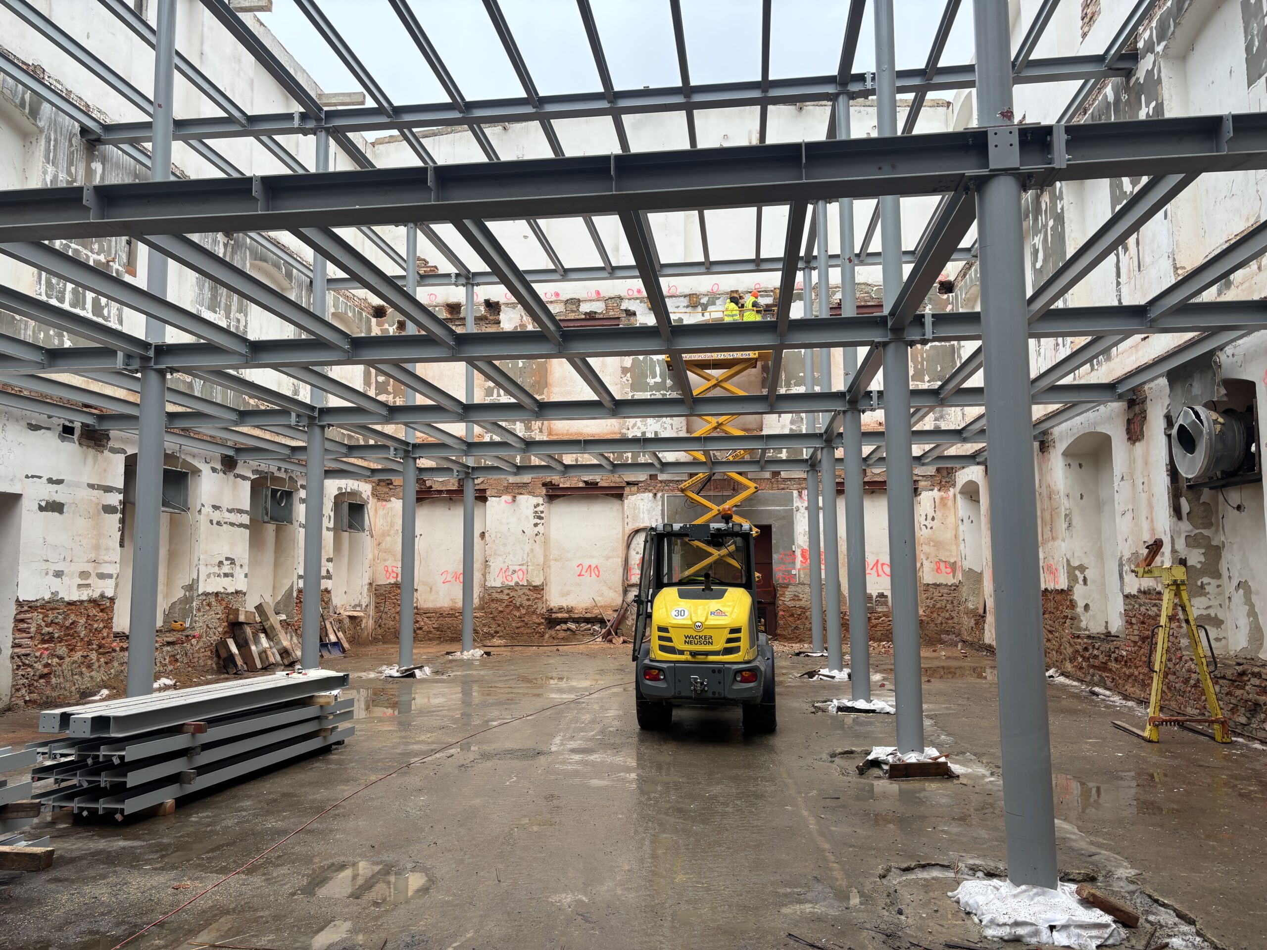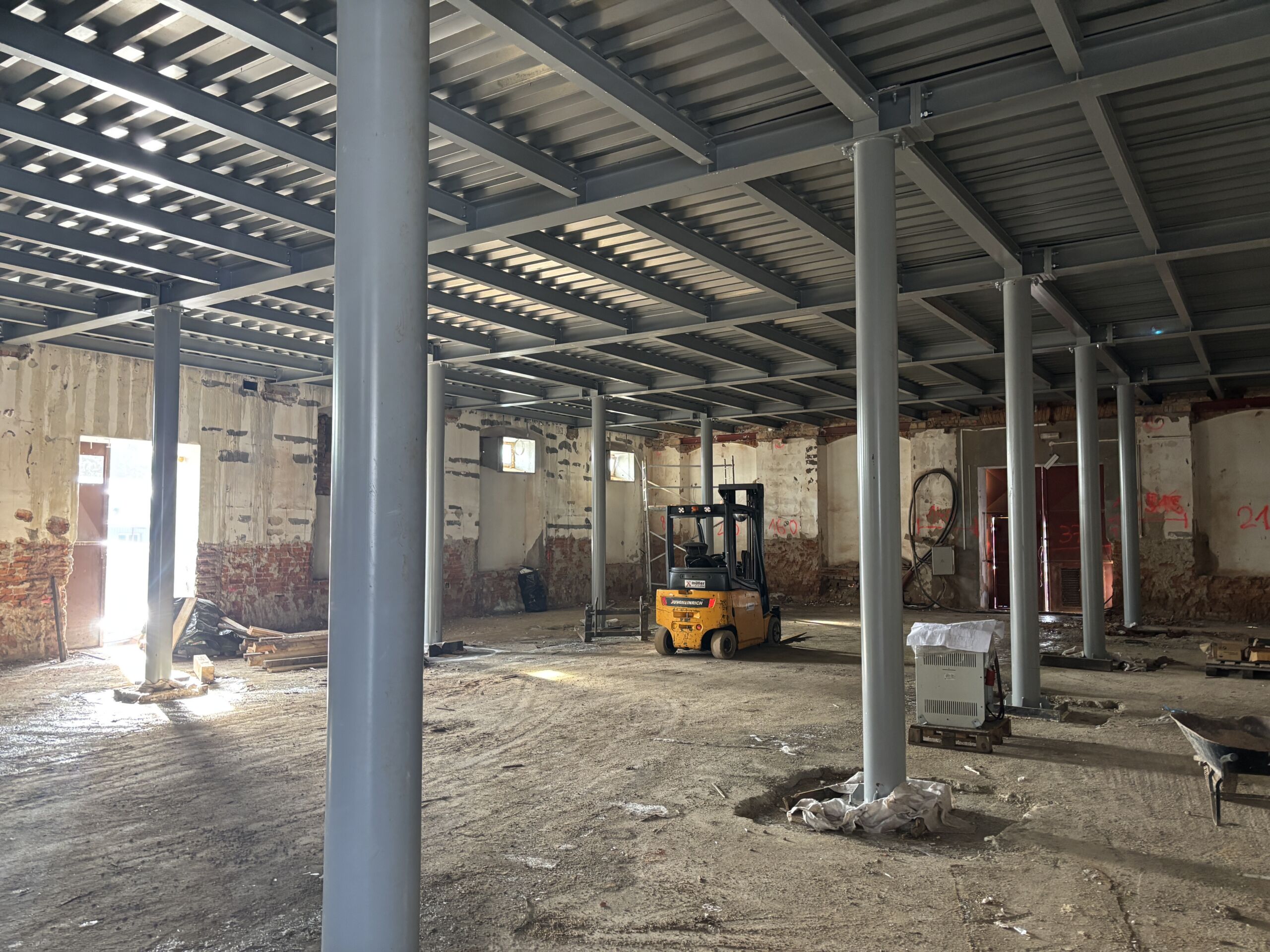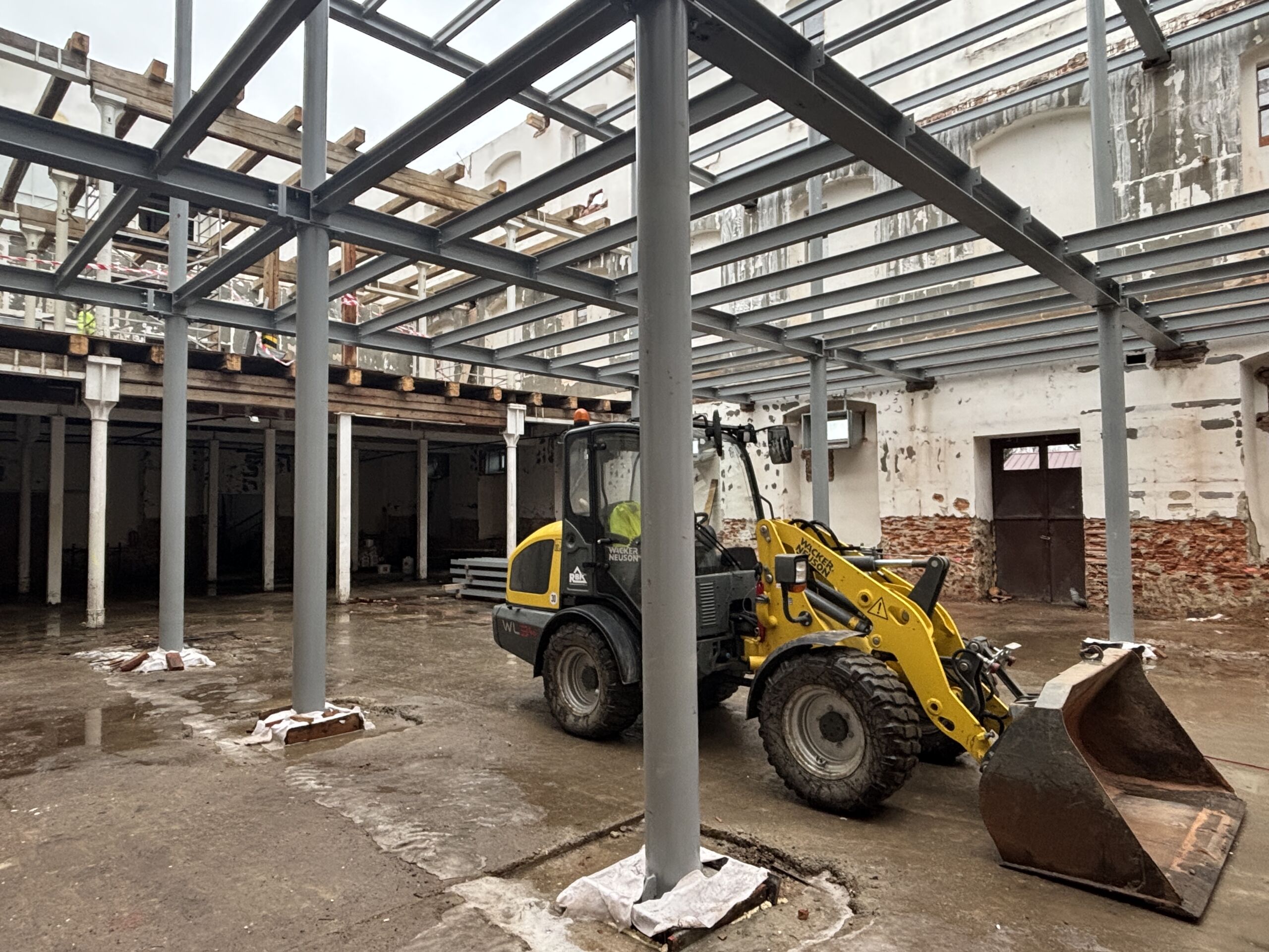 Dodávka bouracích a stavebních prací spočívající v kompletním vybourání stávajících nosných dřevěných konstrukcí objektu včetně střechy a jejich nahrazení ocelovým skeletem a železobetonovými stropy.